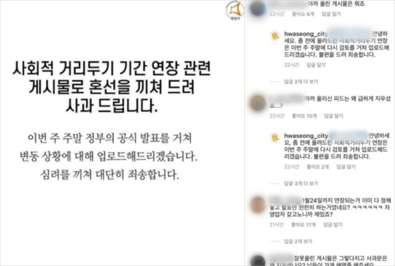 이에 화성시는 "좀 전에 올렸던 거리두기 연장 글은 이번 주말에 다시 검토를 거쳐 올리겠다. 불편을 끼쳐 죄송하다"라고 답을 했지만 누리꾼들은 날짜까지 명시해놓고 국민 가지고 장난을 치느냐? 왜 국민을 기만하느냐 등 불반을 표출하고 있습니다.