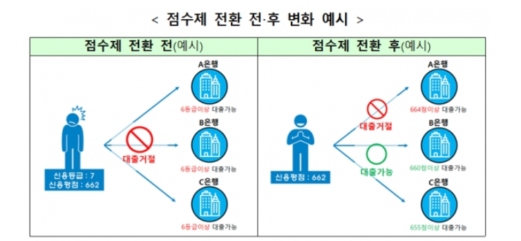 1-10등급으로 나뉘어 1점 차이로 등급이 갈려 대출에 어려움을 겪는 문제가 있었는데, 이에 금융위원회는 신용등급제를 없애고 신용 점수제를 도입해 대출의 문턱을 높였습니다.